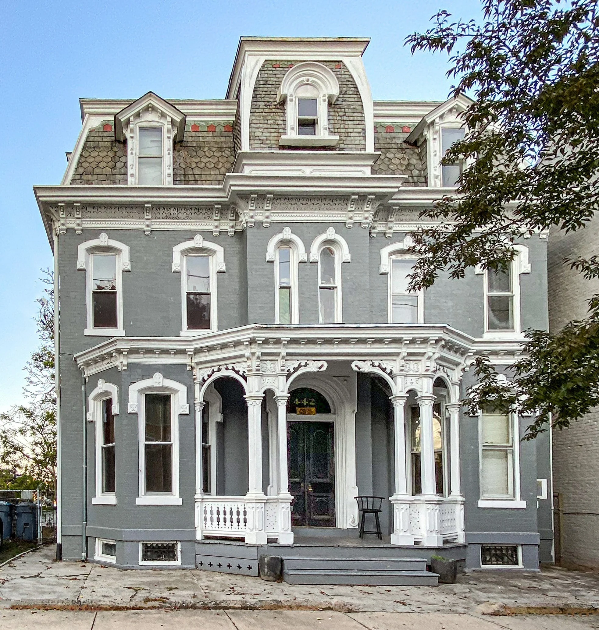 Red-slate dots march across the slate roof. Scroll-sawn tracery softens the cornice. The entry porch has preserved its ornate brackets and balusters. This house is a beauty.