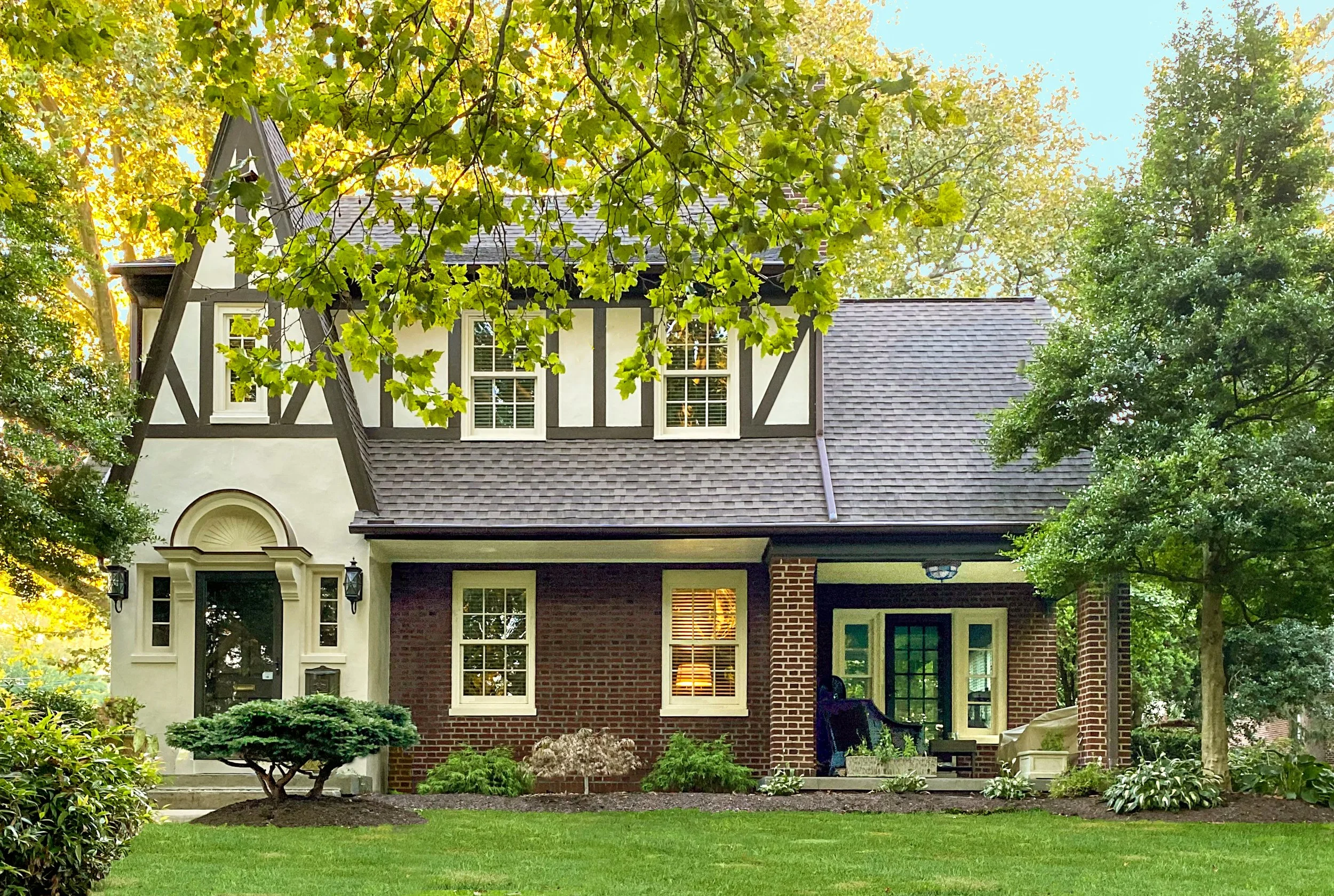 Typical details: Steeply pitched gable roofs, frequent use of stucco, cross gables, half timbering, shed dormers, irregularly spaced windows, leaded glass.