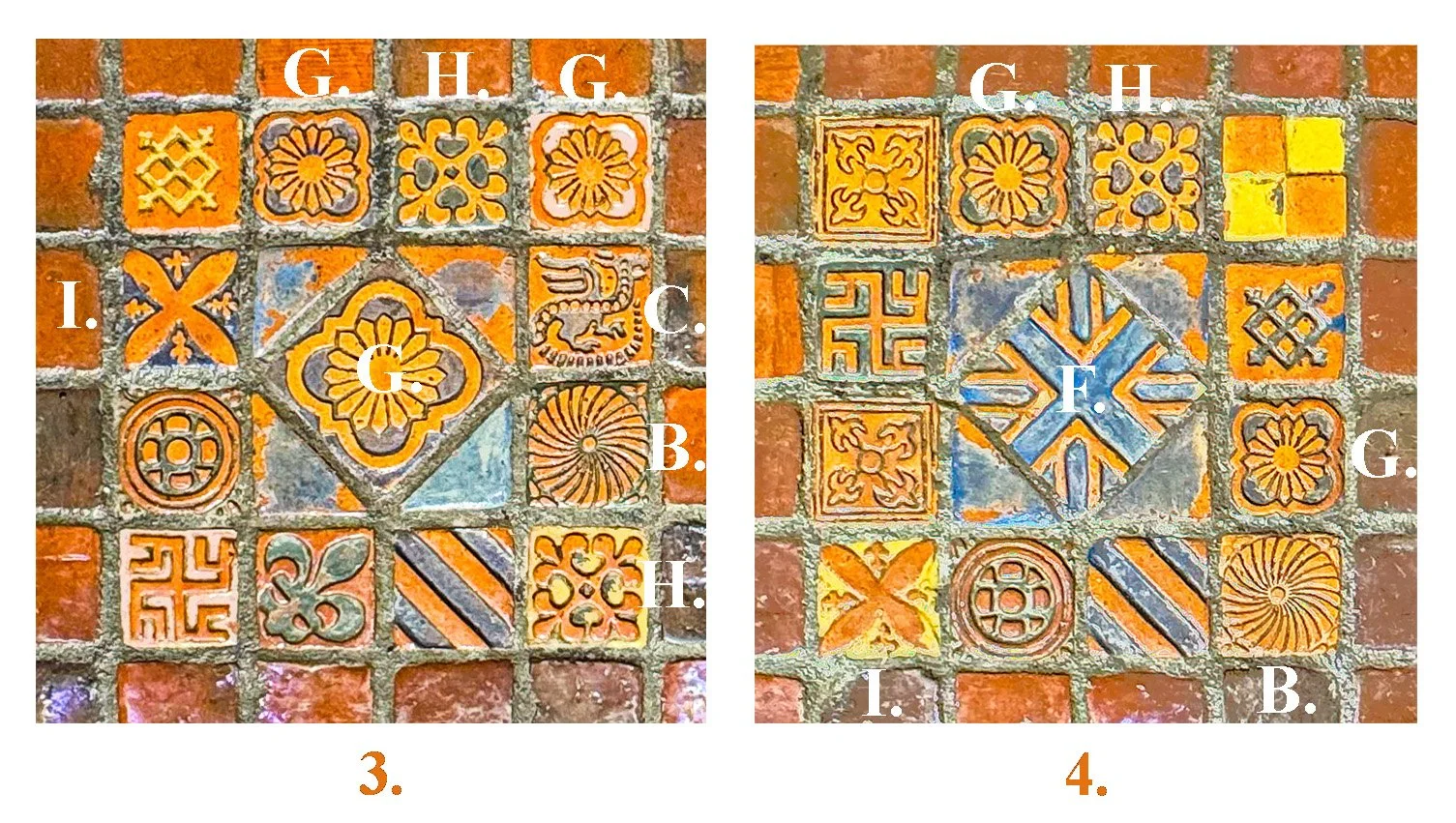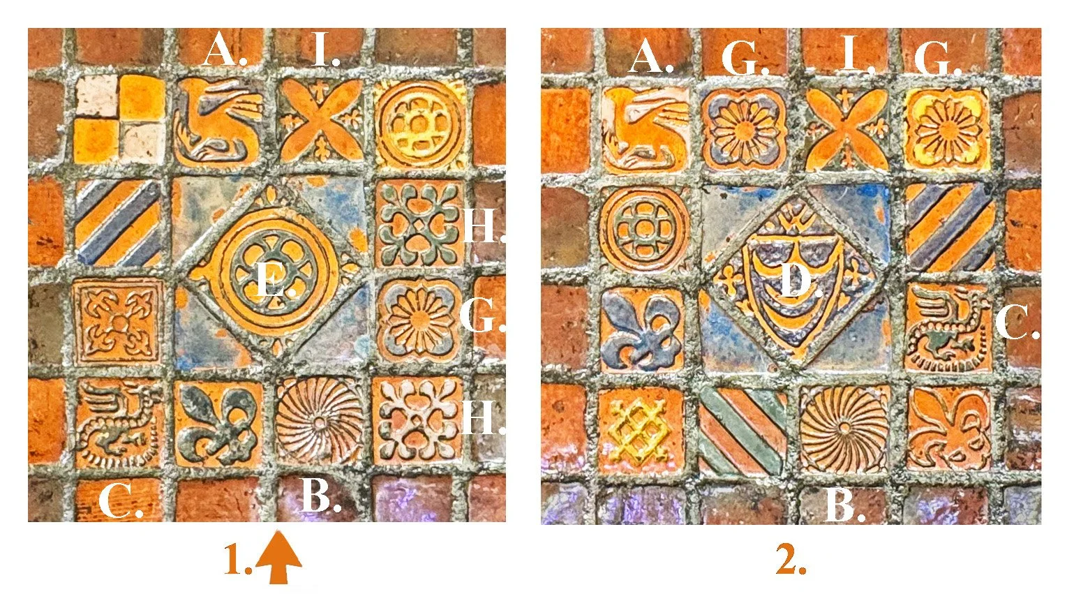 A. Dragon of Castle Acre Priory B. Circle of Castle Acre Priory C. Scaled Dragon of Castle Acre Priory D. Crescent Arms of Castle Acre Priory E. Petals in Double Circle F. Crossed Squares of Eweline, Oxfordshire G. Wheel of Bayeux Normandy H. Quatrefoil of Jervaulx Abbey, Yorkshire I. Quatrefoil and Flowerets of Ecclesiological Society Collection. Other tiles in these groupings are based on historic tiles from other regions, including ancient Persia.