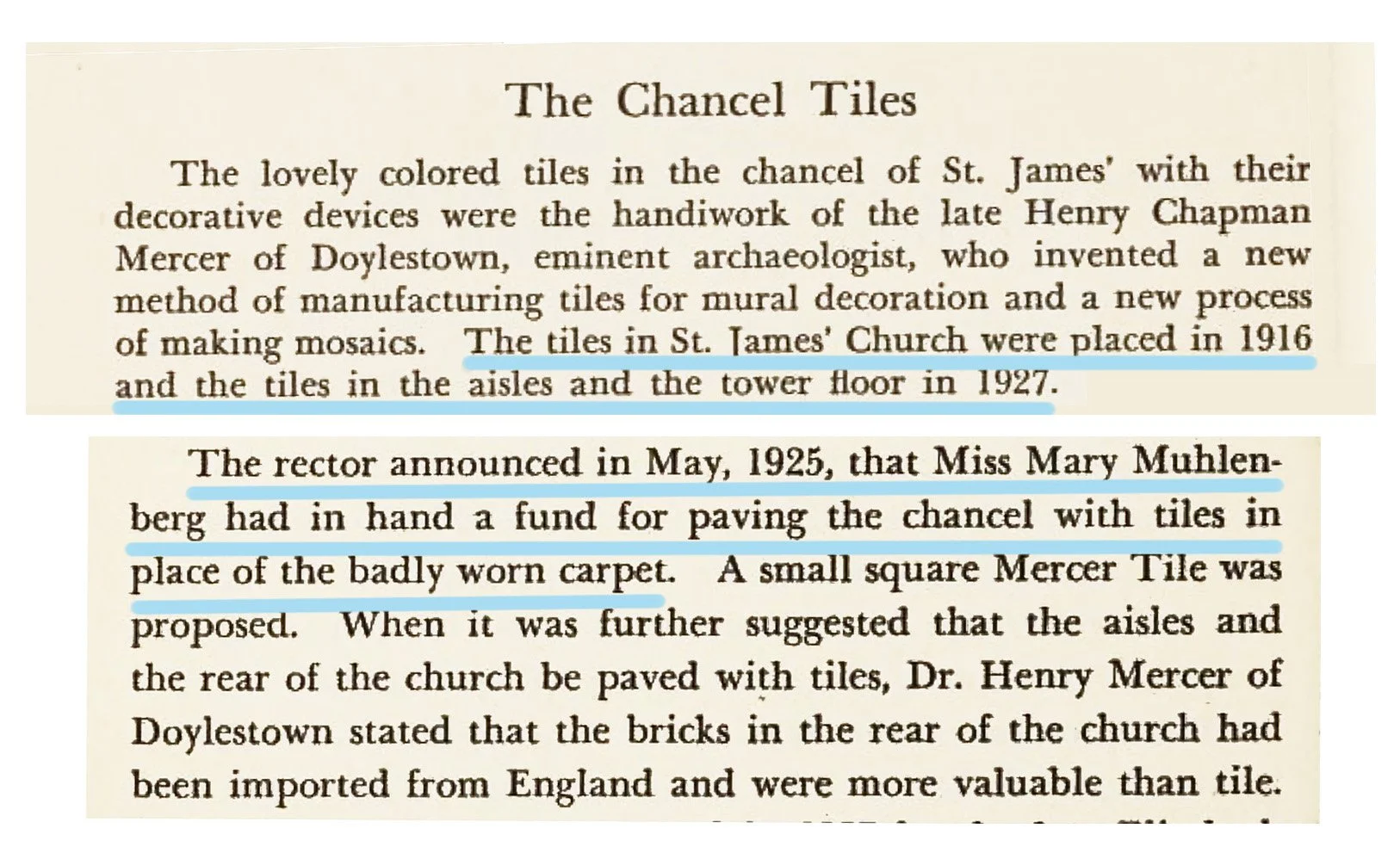 The Mercer tiles of St. James’ chancel floor were funded by Miss Mary Elizabeth Muhlenberg (1853 - 1929). She was a Lancaster resident her entire life. She had a career in nursing and never married. Mary Muhlenberg was active in all branches of church work at St. James. She taught Sunday School, and was with the Women’s Auxiliary and the King’s Daughters. She also worked with the Community Service Association.