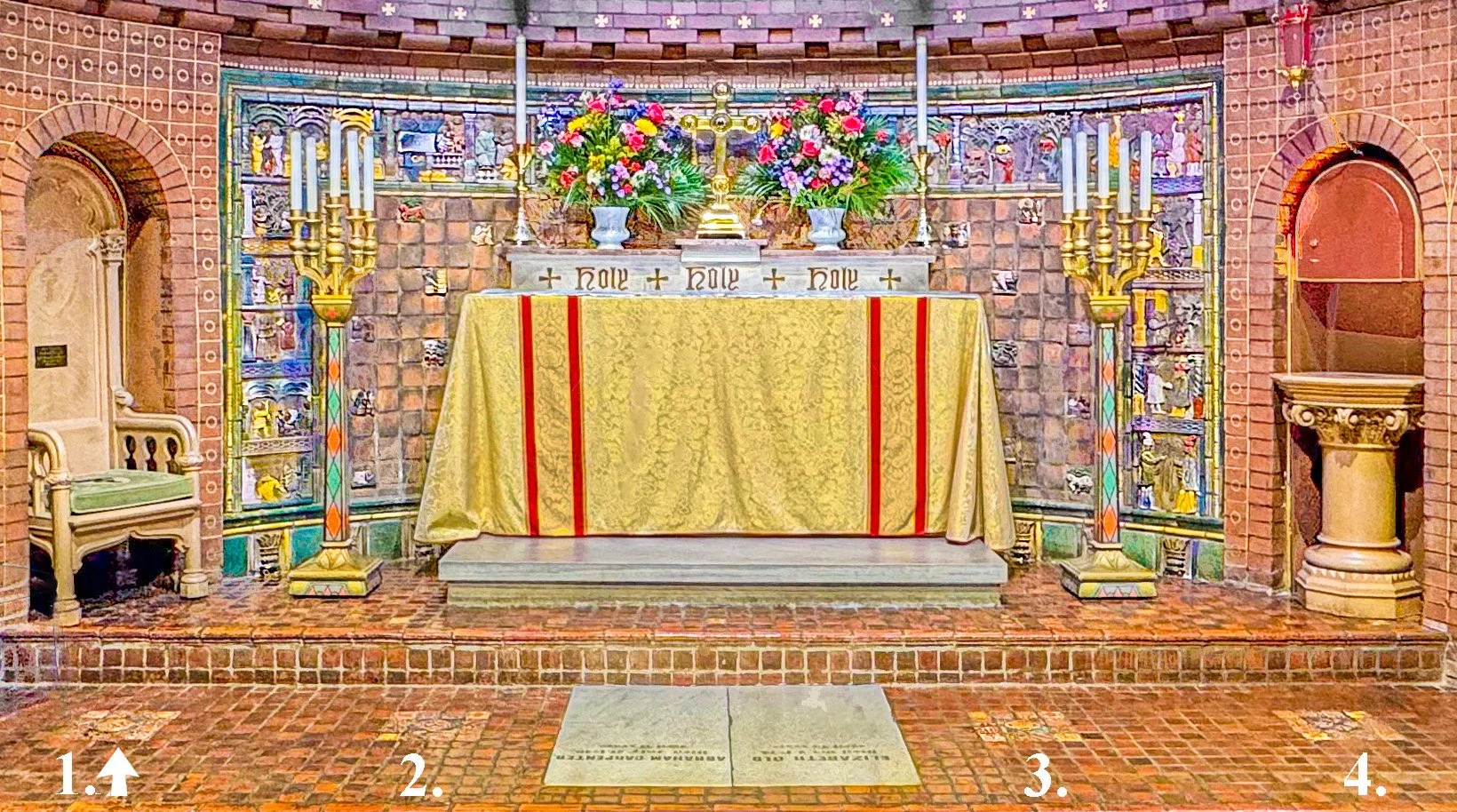 St. James’ chancel has two important installations of Mercer tiles. The best-known tiles here are Mercer’s Bible in Tile series of wall tiles, installed in 1916. Those sculptural panels depict Bible stories. The tiles in those panels are based on biblical scenes that Mercer found on antique Pennsylvania stoves.