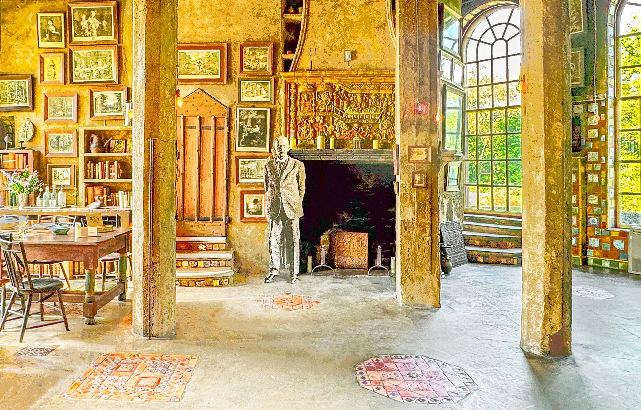 Above: A museum-board portrait of Henry Mercer stands by the fireplace in his castlelike home named Fonthill Castle. Mercer donated this home, his collections, and his Mercer Museum to the Bucks County Historical Society. He created this room to be his dining room / salon. He named this room “The Saloon.”
