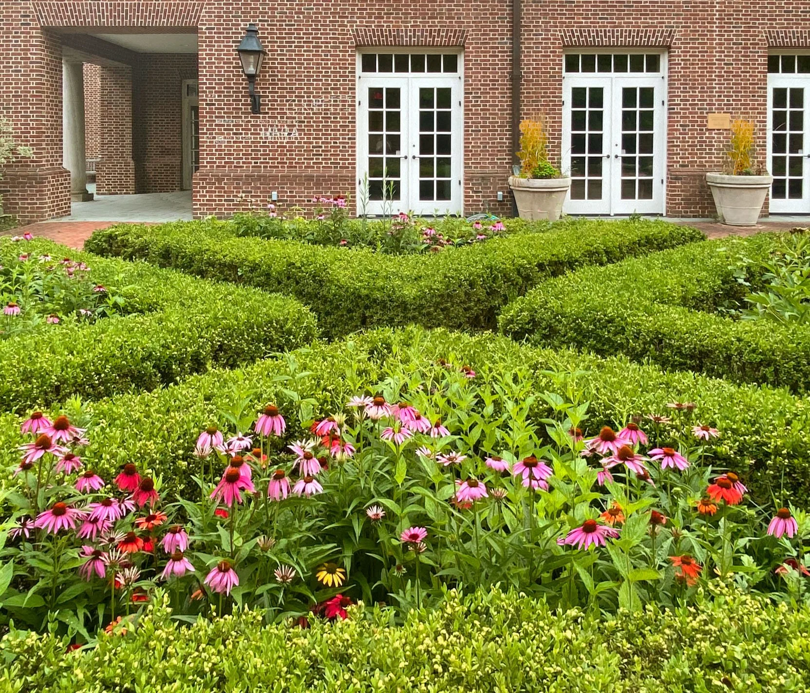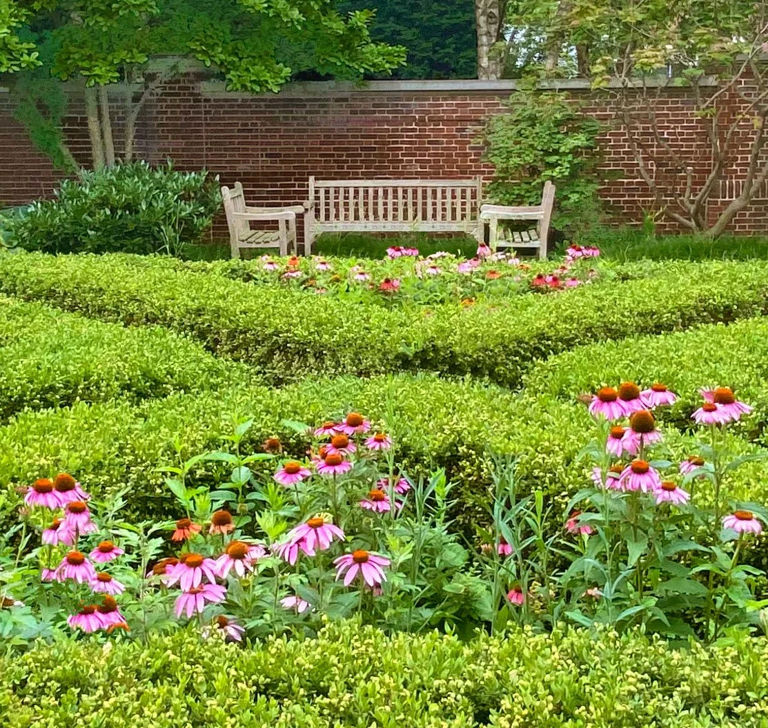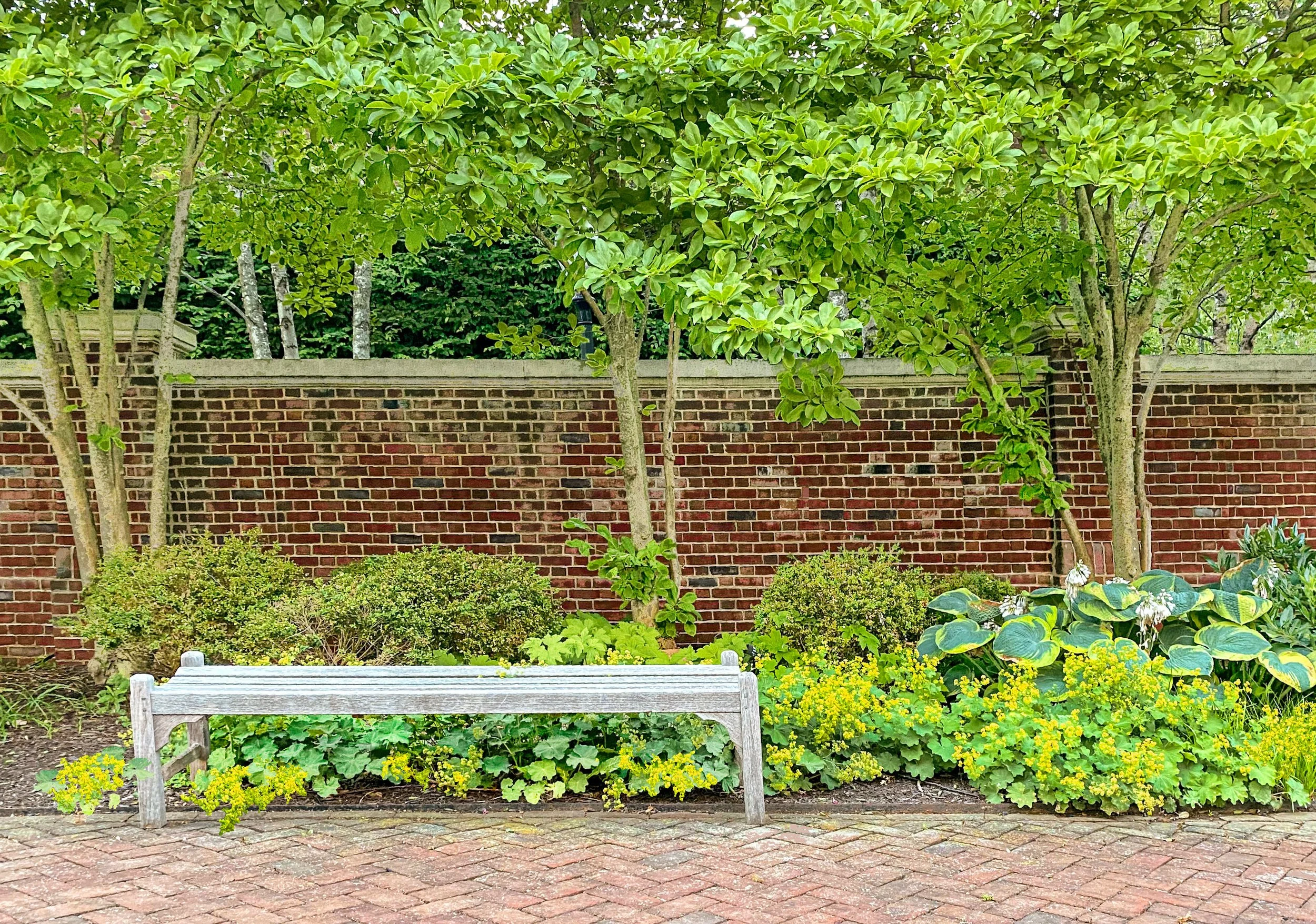 Above: Kousa Dogwood trees (Cornus kousa) flank the entry into the garden.
