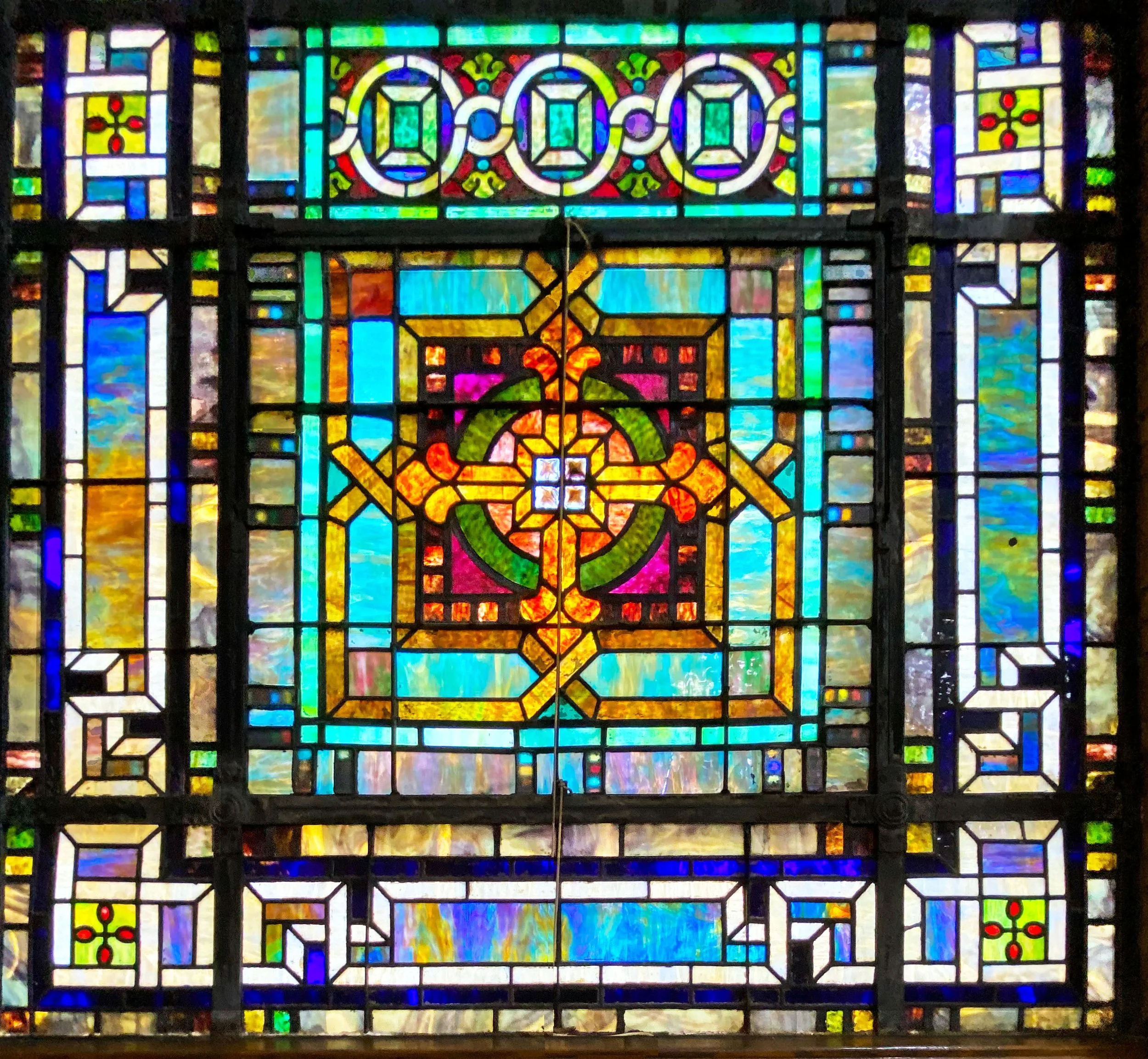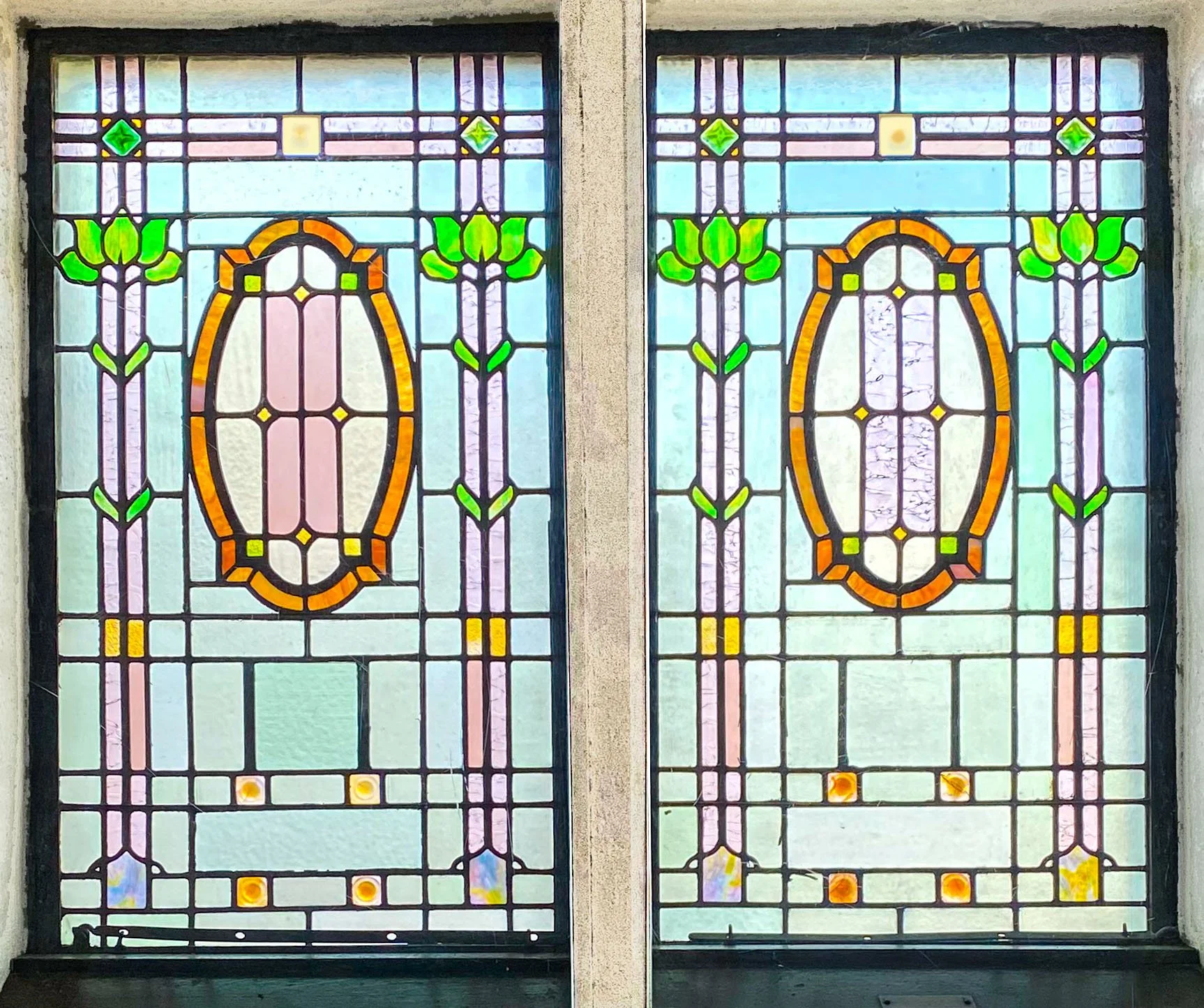 Above: Numerous church windows in this building, like this pair, have rectilinear design that feels somehow related to your window. They feel Modern, not Neo-Gothic. And the five-part leaf clusters are reminiscent of your five-leaf plant designs.